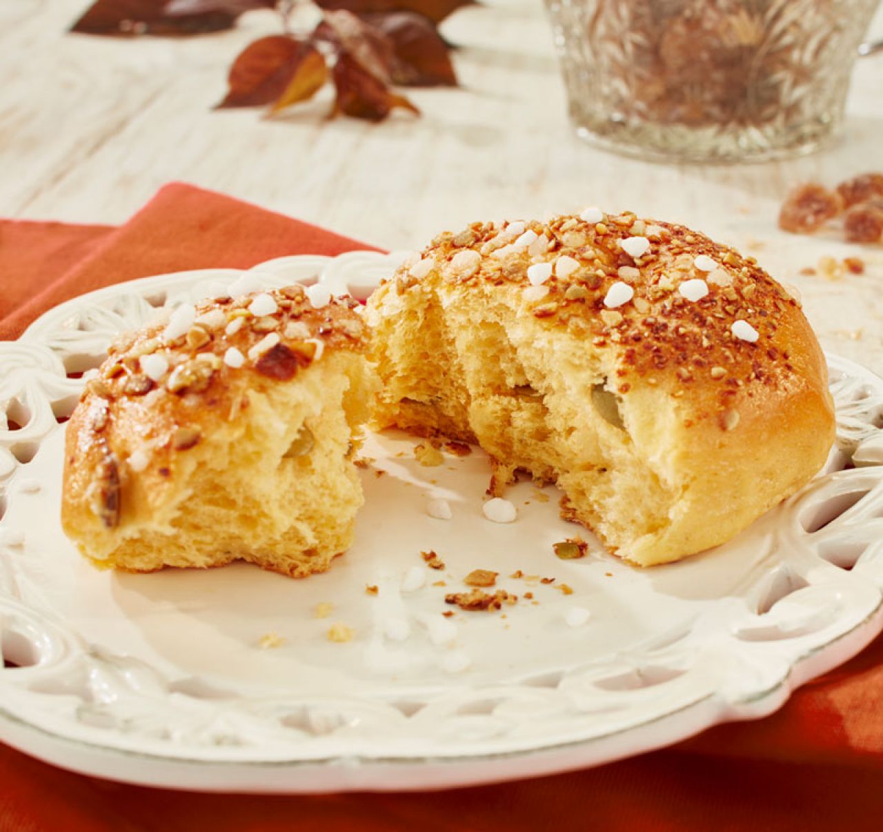 Podzimní kombinace šťavnatého kynutého těsta s tvarohem, dýňovou šťávou a semínky, která dodává pečivu svou lehce dokonalou chuť.