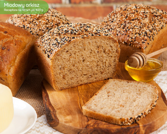 Miodowy Orkisz- chleb z ziarnami orkiszu, na zakwasie orkiszowym, wzbogacony miodem.